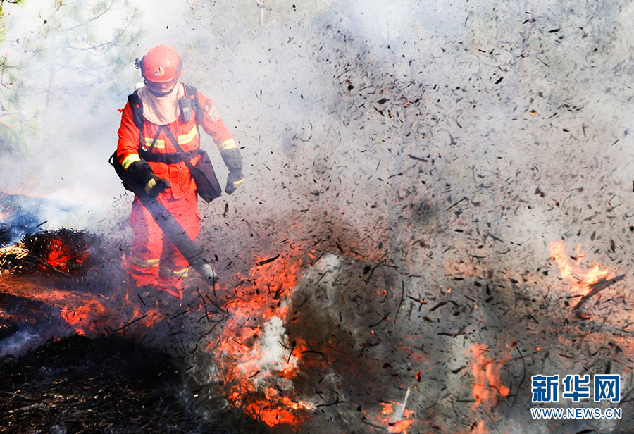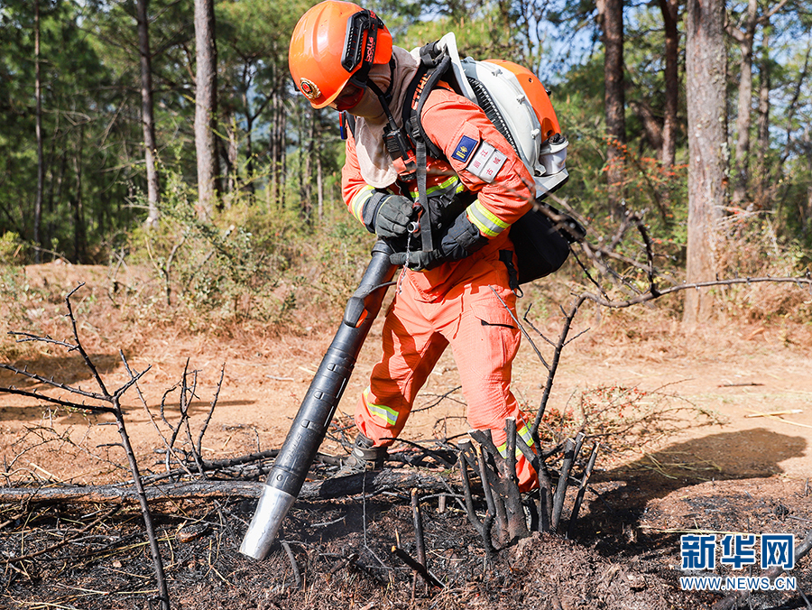 森林消防員利用風力滅火機對火線進行撲打(攝于3月17日)。