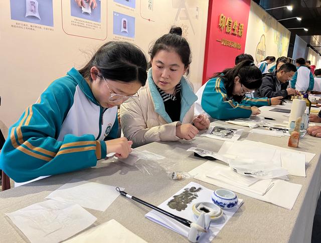 記者在現(xiàn)場看到,此次展覽還設(shè)置了現(xiàn)場體驗環(huán)節(jié)。在沉浸式互動體驗區(qū),來自曲阜市奎文中學(xué)的學(xué)生在孔府印閣手造藝人的指導(dǎo)下體驗傳統(tǒng)篆刻的魅力,感受印信文化。