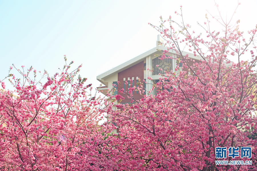 云南民族大學(xué)內(nèi),盛開(kāi)的櫻花與教學(xué)樓相互映襯(3月15日攝)。新華網(wǎng)發(fā)(云南民族大學(xué) 供圖)