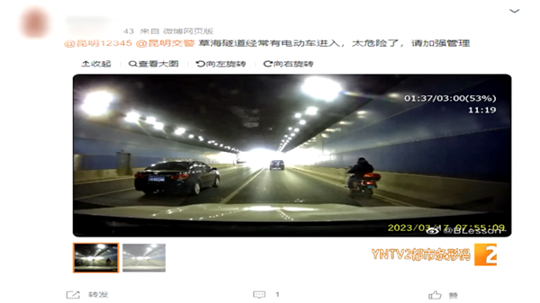 前兩天,有市民在社交平臺上反映,草海隧道經(jīng)常有電動車和摩托車駛?cè)?,十分危險(xiǎn),希望交警部門和隧道管理方加強(qiáng)管理。