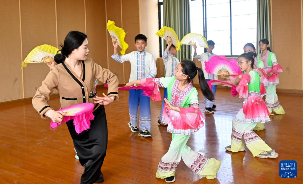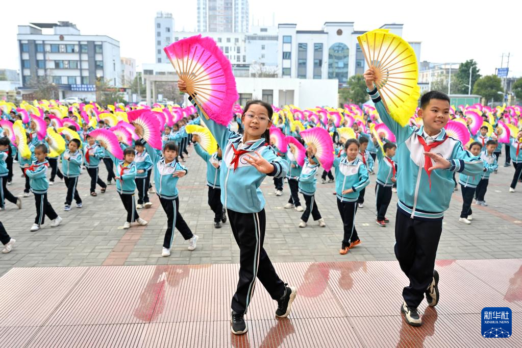 近年來,廣西柳州市柳城縣教育部門把彩調(diào)的一些曲目編排成簡單易學的校園廣播操,并逐步在該縣的各小學推廣,豐富校園文化生活的同時,也讓學生感受到非遺文化的魅力。彩調(diào)劇作為廣西地方傳統(tǒng)戲劇,被列入第一批國家級非物質(zhì)文化遺產(chǎn)名錄。新華社發(fā)(黎寒池 攝)