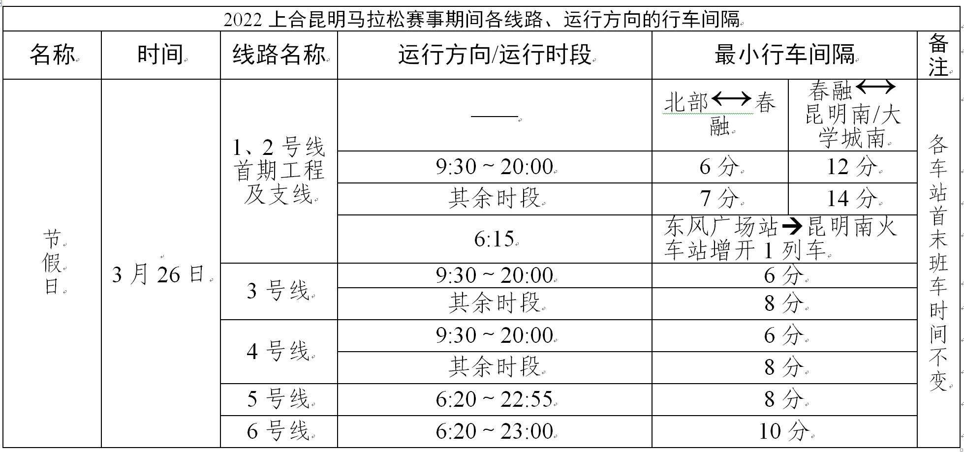2022上合昆明馬拉松賽事期間按雙休日運(yùn)行圖正常組織行車(chē)。遇特殊情況,以上級(jí)部門(mén)下達(dá)的通知為準(zhǔn)。