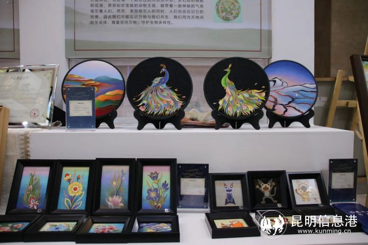 德源文化公司的掐絲琺瑯文創(chuàng)作品,將傳統(tǒng)非遺技藝與云南地標、云南特色相結(jié)合,以展現(xiàn)金馬碧雞坊來源的作品《金碧生煙》,表現(xiàn)云南“動植物王國”和生物多樣性的作品《向往云南》,以及光影之下的元陽梯田、開屏的孔雀等,一幅幅講述云南故事的作品,不僅能作為旅游商品,通過使用創(chuàng)新活性炭材料,更是兼具了吸附異味的功能性。