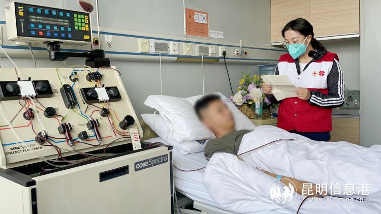 當(dāng)天上午,在昆明醫(yī)科大學(xué)第二附屬醫(yī)院血液科血細(xì)胞分離室,小業(yè)整齊地穿著一身綠色作訓(xùn)服,在妻子的陪伴下進(jìn)行造血干細(xì)胞采集。小業(yè)回憶道,從登記到捐獻(xiàn)不到三年時(shí)間,心情激動(dòng)又驚喜。