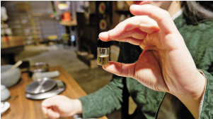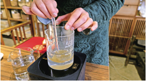 煉蜜過(guò)程引起我們的濃厚興趣。把蜂蜜隔水蒸,煉到一定程度,滴到水里,如果化開(kāi)了,需繼續(xù)煉制,直到在水里呈水滴狀,化不開(kāi)。溫度、時(shí)間都要精準(zhǔn)地把控好。