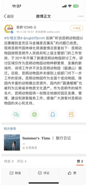 當(dāng)時,昆明12345熱線微博回復(fù)市民稱:“昆明動物園按照昆明市人民政府和上級主管部門的工作安排,于2011年開展了新建昆明動物園研討工作。研討區(qū)域僅作為昆明動物園動物種群繁育、發(fā)展的新場所,該項工作并不涉及昆明動物園(圓通山)搬遷?!?/p>