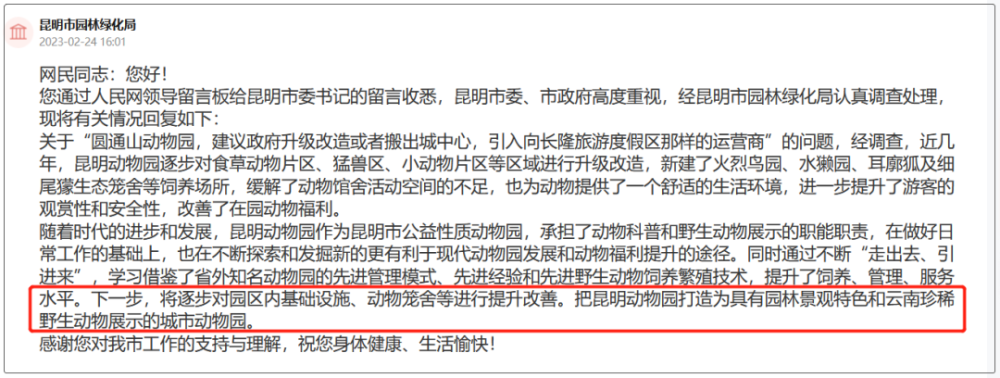 昆明市園林綠化局對(duì)此回復(fù)稱(chēng):近年來(lái),園區(qū)已逐步對(duì)動(dòng)物園進(jìn)行了改造,緩解了動(dòng)物館舍活動(dòng)空間的不足;下一步,還將逐步對(duì)園區(qū)內(nèi)基礎(chǔ)設(shè)施、動(dòng)物籠舍等進(jìn)行提升改善,把昆明動(dòng)物園打造為具有園林景觀(guān)特色,以及云南珍稀野生動(dòng)物展示的城市動(dòng)物園。