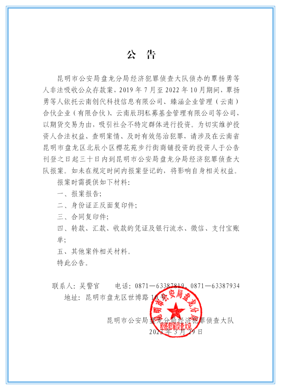3月29日,據(jù)“云南經(jīng)偵”消息,2019年7月至2022年10月期間,覃揚(yáng)勇等人依托云南創(chuàng)代科技信息有限公司、臻涵企業(yè)管理 (云南 )合伙企業(yè)(有限合伙 )、云南辰明私募基金管理有限公司等公司以期貨交易為由,吸引社會(huì)不特定群體進(jìn)行投資。