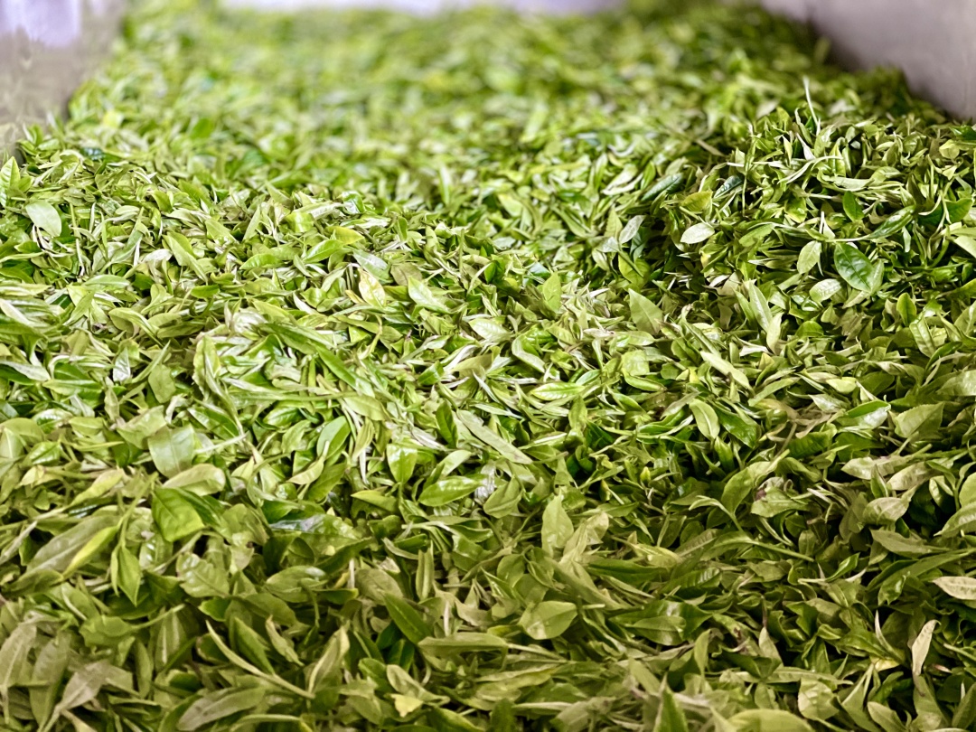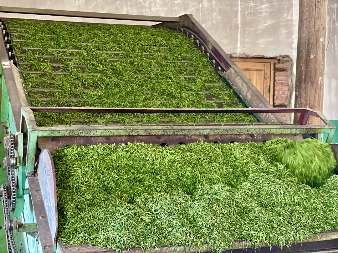 在青龍山茶葉專業(yè)合作社的車間里,采摘完的茶葉經(jīng)過多道制茶工序后,變得翠綠顯毫,空氣中彌漫著春茶的清香,沁人心脾。據(jù)了解,現(xiàn)在正是茶葉采摘旺季,合作社收購茶農(nóng)采摘來的新鮮茶葉,價格達(dá)到2.5元一斤。新采摘的茶葉進(jìn)行篩選后,會經(jīng)過晾干、殺青、炒熟、理條、烘干等步驟,制成成品茶,然后銷往全國各地。