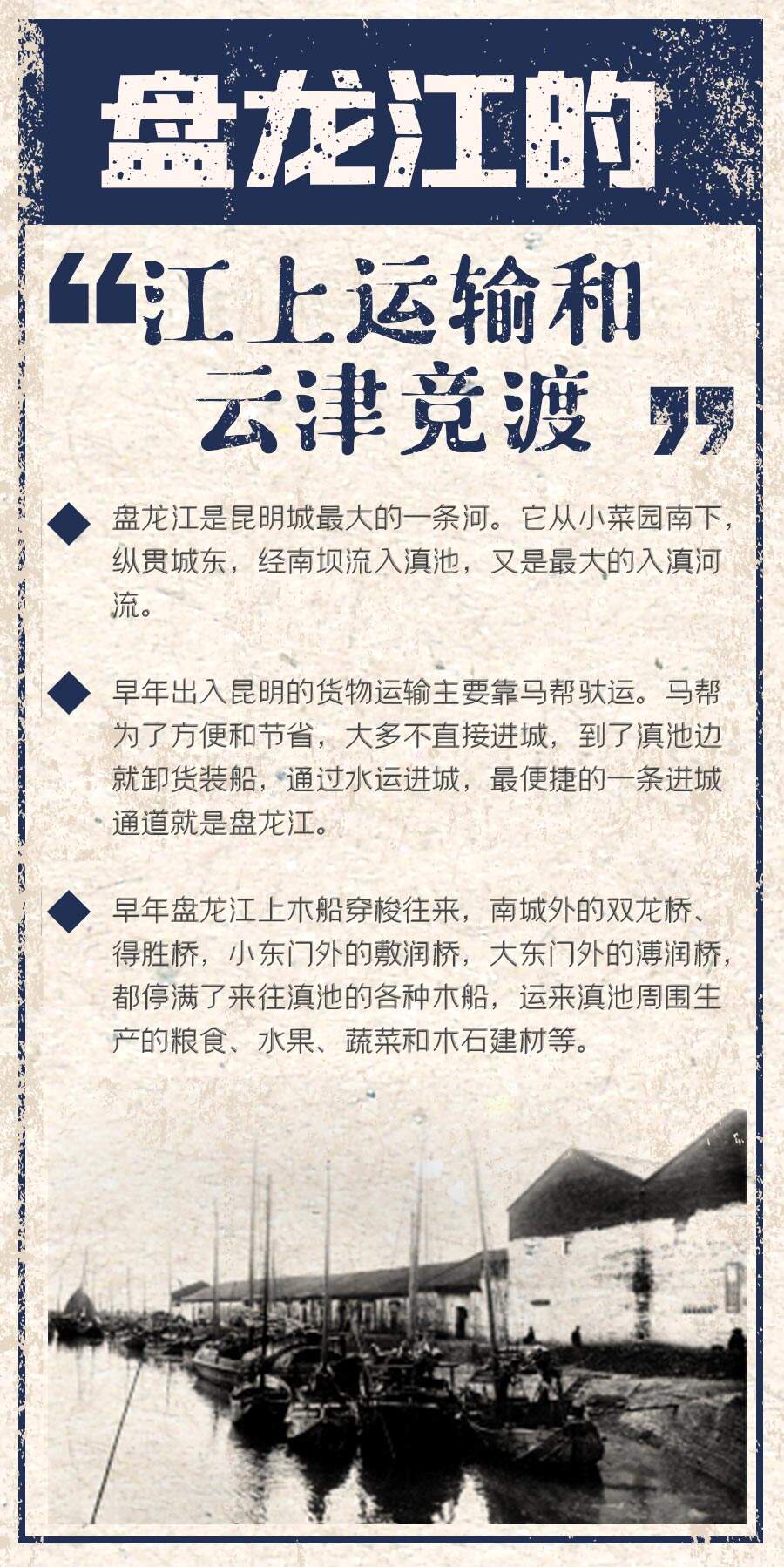 盤龍江是昆明城最大的一條河。它從小菜園南下,縱貫城東,經(jīng)南壩流入滇池,又是最大的入滇河流。對(duì)于昆明人來(lái)說(shuō),盤龍江是一條飲水之河、一條灌溉之河、一條打魚(yú)之河,還是一條航運(yùn)之河。早年出入昆明的貨物運(yùn)輸主要靠馬幫馱運(yùn)。