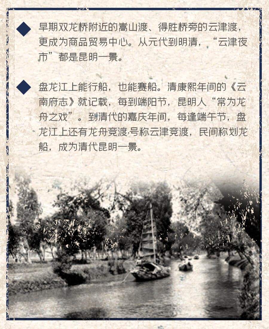 早年盤龍江上木船穿梭往來(lái),南城外的雙龍橋、得勝橋,小東門外的敷潤(rùn)橋,大東門外的溥潤(rùn)橋,都停滿了來(lái)往滇池的各種木船,運(yùn)來(lái)滇池周圍生產(chǎn)的糧食、水果、蔬菜和木石建材,還有來(lái)自滇南、滇西南、滇東南、滇西、滇西北的種種特產(chǎn),甚至還有來(lái)自緬甸、泰國(guó)、老撾、越南等東南亞國(guó)家的“夷方貨”。早期雙龍橋附近的嵩山渡、得勝橋旁的云津渡,更成為商品貿(mào)易中心。從元代到明清,“云津夜市”都是昆明一景。滇池的小船可以穿橋過(guò)河,把大量農(nóng)產(chǎn)品和水產(chǎn)品運(yùn)到昆明大東門外的溥潤(rùn)橋下。途中過(guò)橋洞時(shí),只要放倒桅桿,就可以暢行無(wú)阻。溥潤(rùn)橋成為糧食集散加工中心,稱作“米廠心”,還形成了菜市、豬市和馬廠等大牲畜交易市場(chǎng)。直到20世紀(jì)中期,還有不少兩頭尖的“豆角船”滿載蔬菜等來(lái)往盤龍江上,行到橋下,船夫用撐篙一點(diǎn)橋墩,撥正船身,穿橋而過(guò),十分輕便。