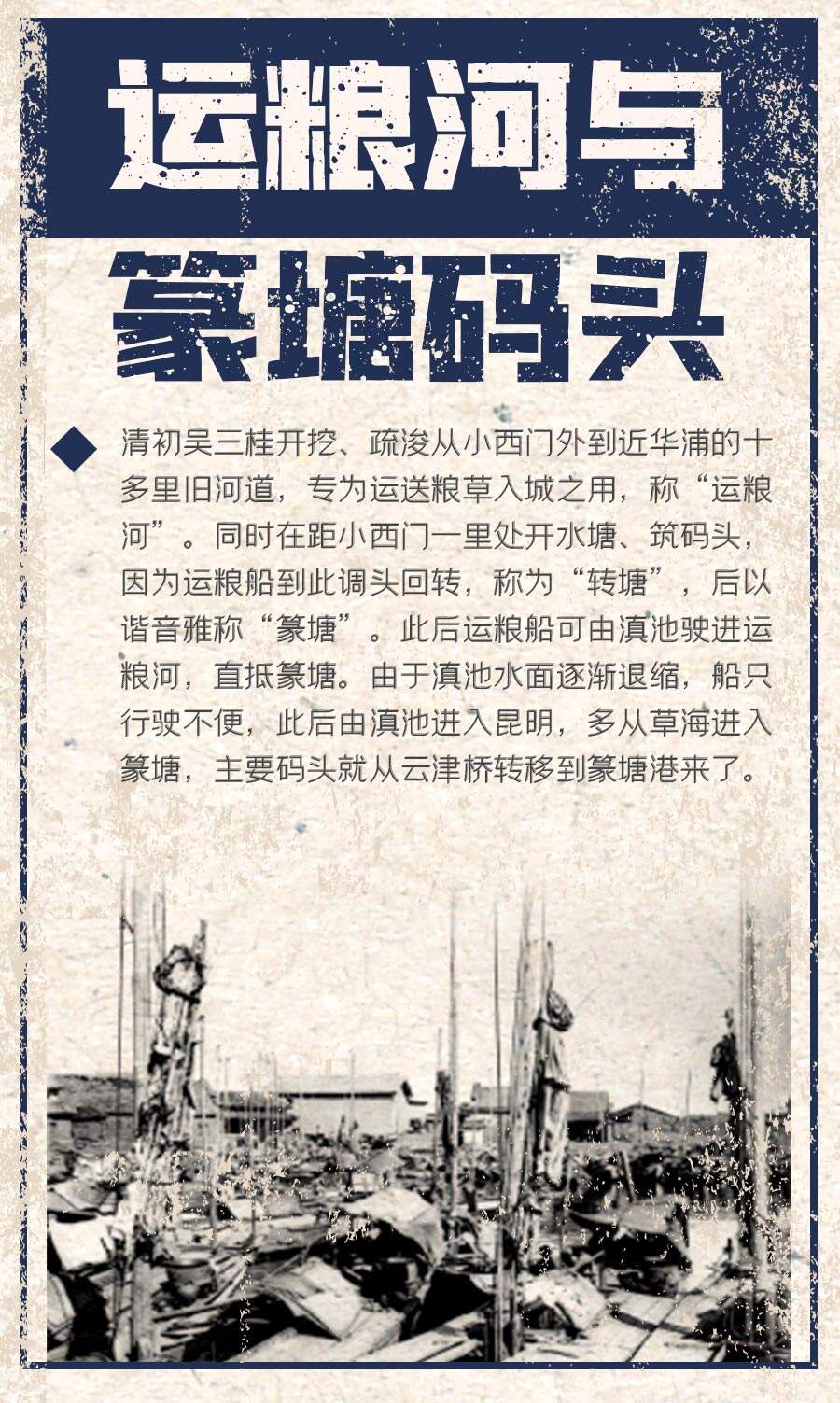 清初吳三桂在昆明屯集重兵,所需糧草大多經(jīng)滇池運(yùn)來(lái)。由于歷代不斷疏浚滇池出???,滇池水位下降,草海退縮,原有河道干涸變窄,行船不便,糧草運(yùn)送困難。1673年,吳三桂重新開(kāi)挖、疏浚從小西門外到近華浦的十多里舊河道,專為運(yùn)送糧草入城之用,稱“運(yùn)糧河”。同時(shí)在距小西門一里處開(kāi)水塘、筑碼頭,因?yàn)檫\(yùn)糧船到此調(diào)頭回轉(zhuǎn),稱為“轉(zhuǎn)塘”,后以諧音雅稱“篆塘”。碼頭邊則興建倉(cāng)庫(kù),后稱為“倉(cāng)儲(chǔ)里”(在今慶豐街口,大觀商業(yè)城南)。