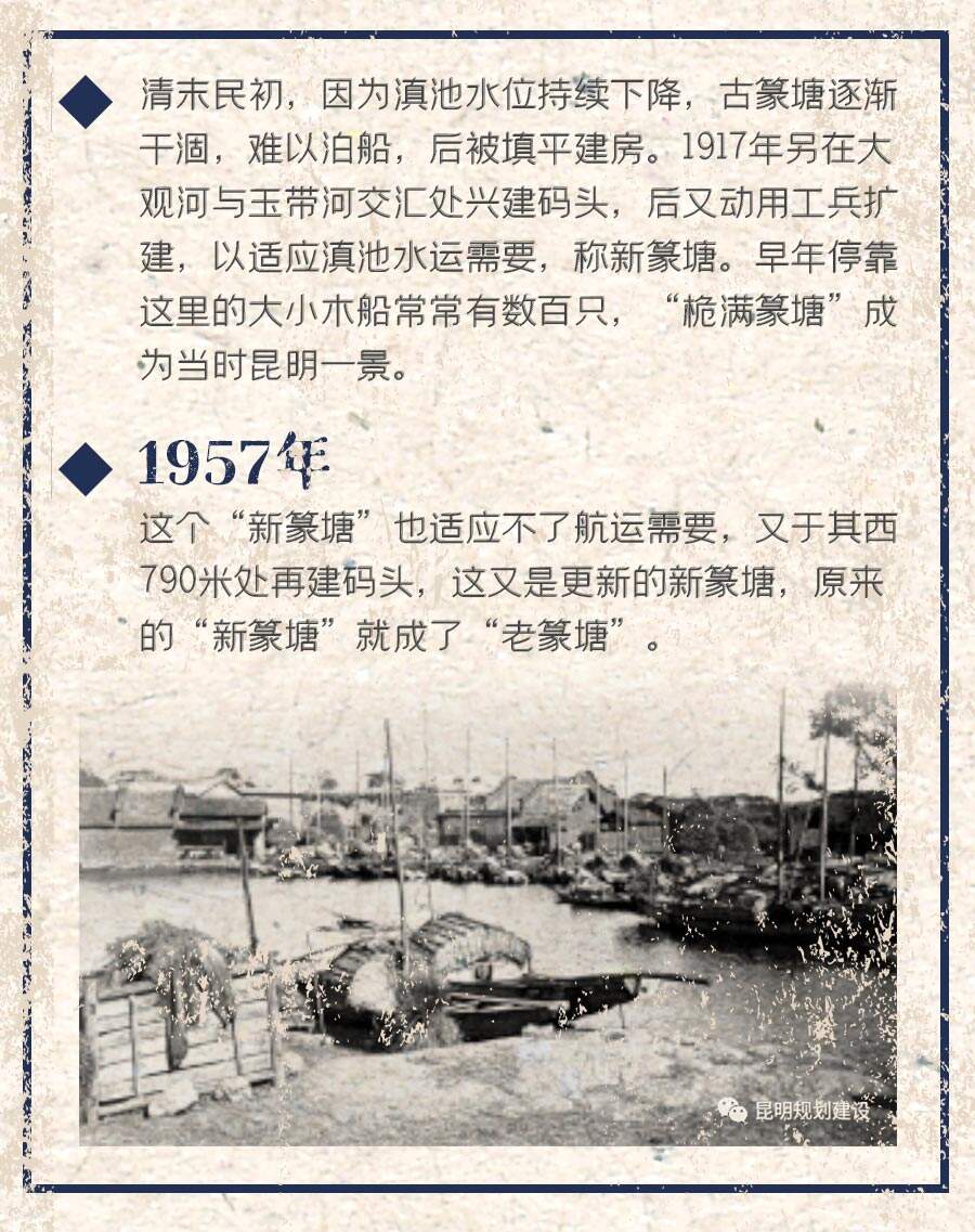 到清末民初,因?yàn)榈岢厮怀掷m(xù)下降,古篆塘逐漸干涸,難以泊船,后被填平建房。1917年另在大觀河與玉帶河交匯處興建碼頭,后又動(dòng)用工兵擴(kuò)建,以適應(yīng)滇池水運(yùn)需要,稱新篆塘。早年??窟@里的大小木船常常有數(shù)百只,“桅滿篆塘”成為當(dāng)時(shí)昆明一景。1957年,這個(gè)“新篆塘”也適應(yīng)不了航運(yùn)需要,又于其西790米處再建碼頭,這又是更新的新篆塘,原來(lái)的“新篆塘”就成了“老篆塘”。而今滇池環(huán)湖公路運(yùn)輸發(fā)達(dá),水運(yùn)基本停止,一“新”一“老”兩個(gè)篆塘都變成公園的水池了。