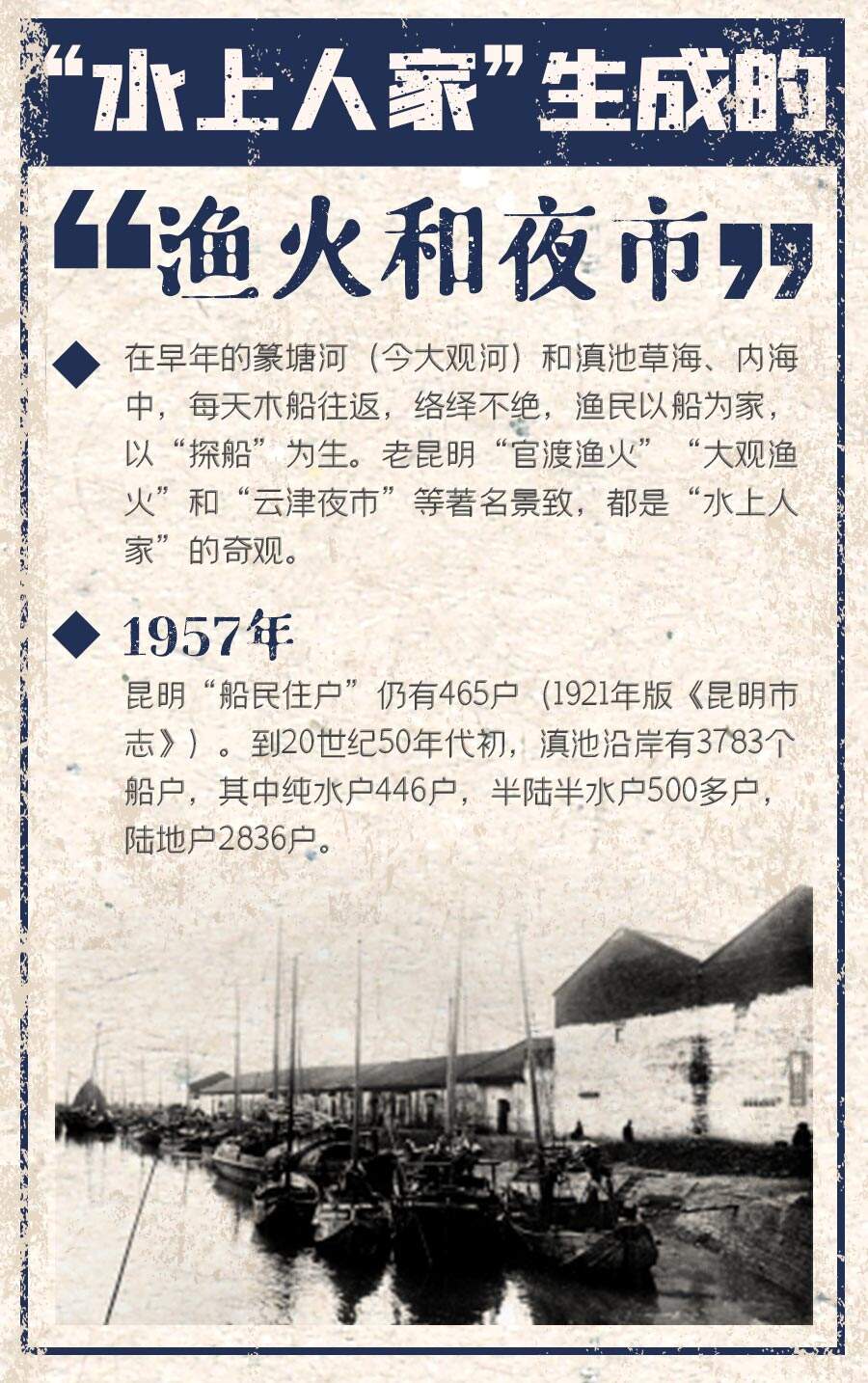 后來(lái)“水上人家”逐漸遷居到岸上,到20世紀(jì)50年代初,滇池沿岸有3783個(gè)船戶,其中純水戶446戶,半陸半水戶500多戶,陸地戶2836戶。到如今,“滇池漁火”之景只有讓后人想象了。