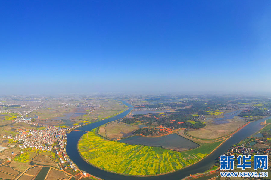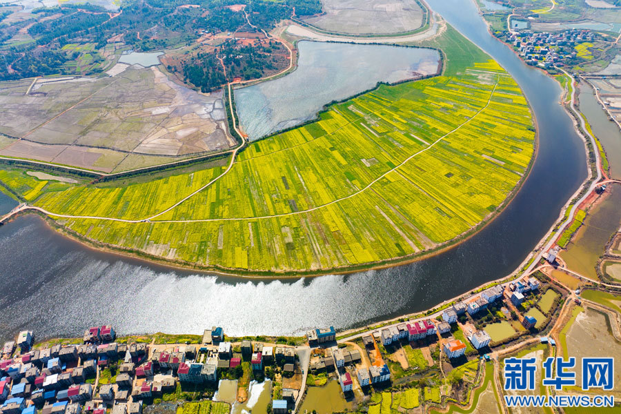 余干縣油菜花海與鄉(xiāng)村道路、水系、農(nóng)舍構(gòu)成一幅美麗的鄉(xiāng)村畫卷。新華網(wǎng)發(fā)韓海建/攝