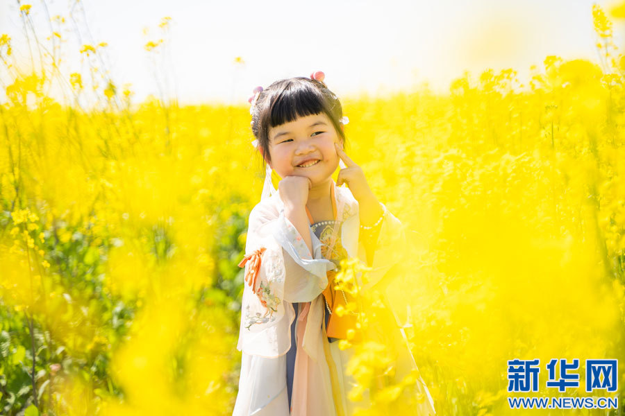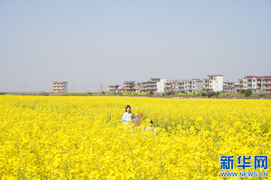 游客在余干縣三塘鄉(xiāng)神埠村油菜花田游玩。新華網(wǎng)發(fā)韓海建/攝