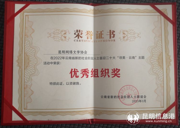 昆明信息港訊 4月7日上午,由云南省委統(tǒng)戰(zhàn)部、云南省委網(wǎng)信辦、云南省文聯(lián)指導(dǎo),云南省新的社會階層人士聯(lián)誼會主辦的2022年尋美.云南表彰會暨2023尋美.云南啟動儀式在昆明舉辦。同日,全國首屆新的社會階層人士服務(wù)團(tuán)網(wǎng)絡(luò)人士大會暨“凝聚新力量 筑夢新時代”——2023年“尋美·中國”主題活動啟動大會在天津舉辦。在2022年“尋美·云南”主題活動中,昆明網(wǎng)絡(luò)文學(xué)協(xié)會榮獲優(yōu)秀組織獎。并且,在“尋美·中國”啟動大會上,昆明網(wǎng)絡(luò)文學(xué)協(xié)會會員張一驍?shù)淖髌帆@評優(yōu)秀作品獎。