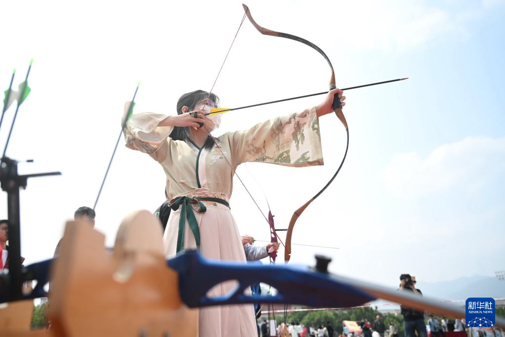 4月8日,學生在福州大學城“優(yōu)秀傳統(tǒng)文化進校園”開幕式上體驗射箭。