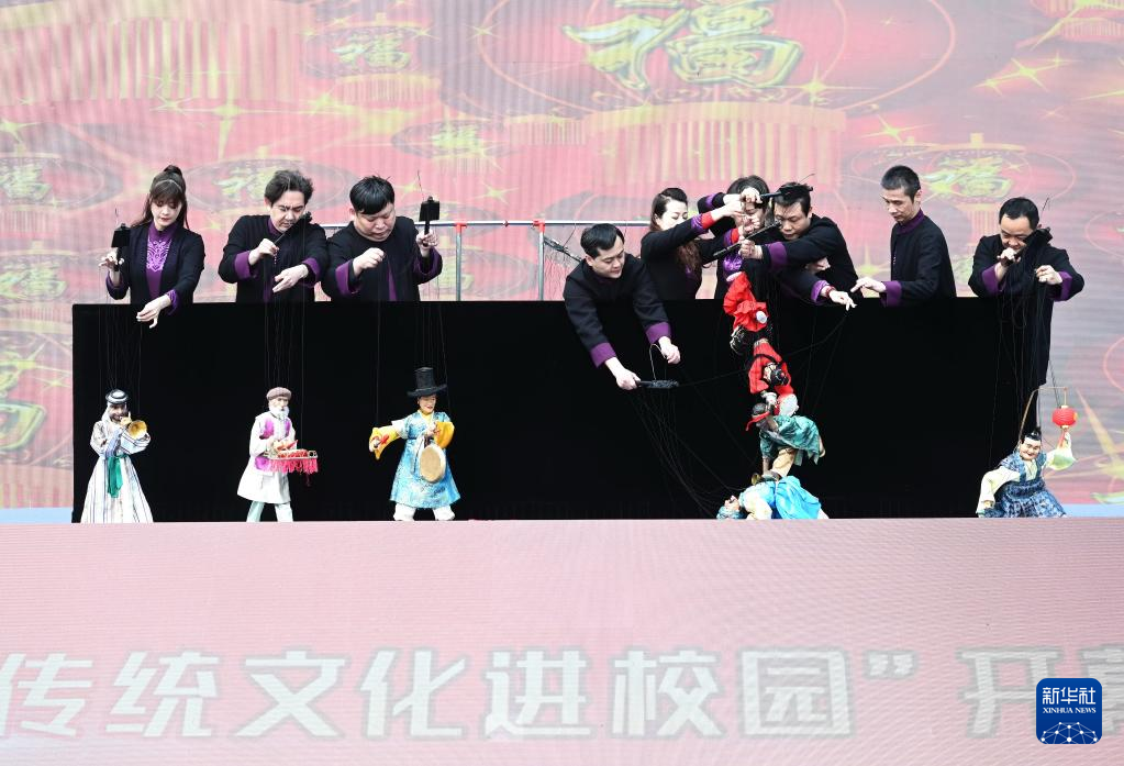 4月8日,泉州市提線木偶戲傳承保護中心演員在福州大學城“優(yōu)秀傳統(tǒng)文化進校園”開幕式上表演提線木偶戲《元宵樂》。
