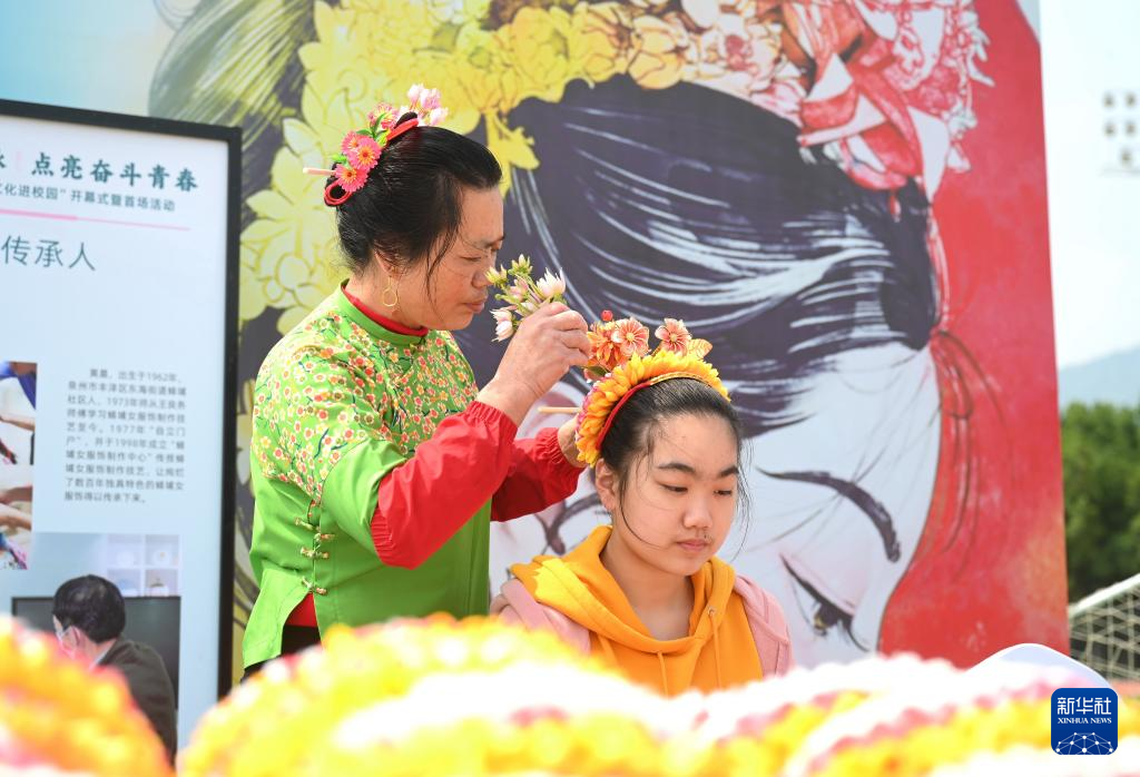 當日,以“傳承文化根脈 點亮奮斗青春”為主題的福州大學城“優(yōu)秀傳統(tǒng)文化進校園”開幕式在福建醫(yī)科大學旗山校區(qū)舉行?,F(xiàn)場舉行了非遺傳承人與高校社團結對子、非遺藝術展演、傳統(tǒng)文化講座等多項活動。(新華社 記者林善傳/攝)