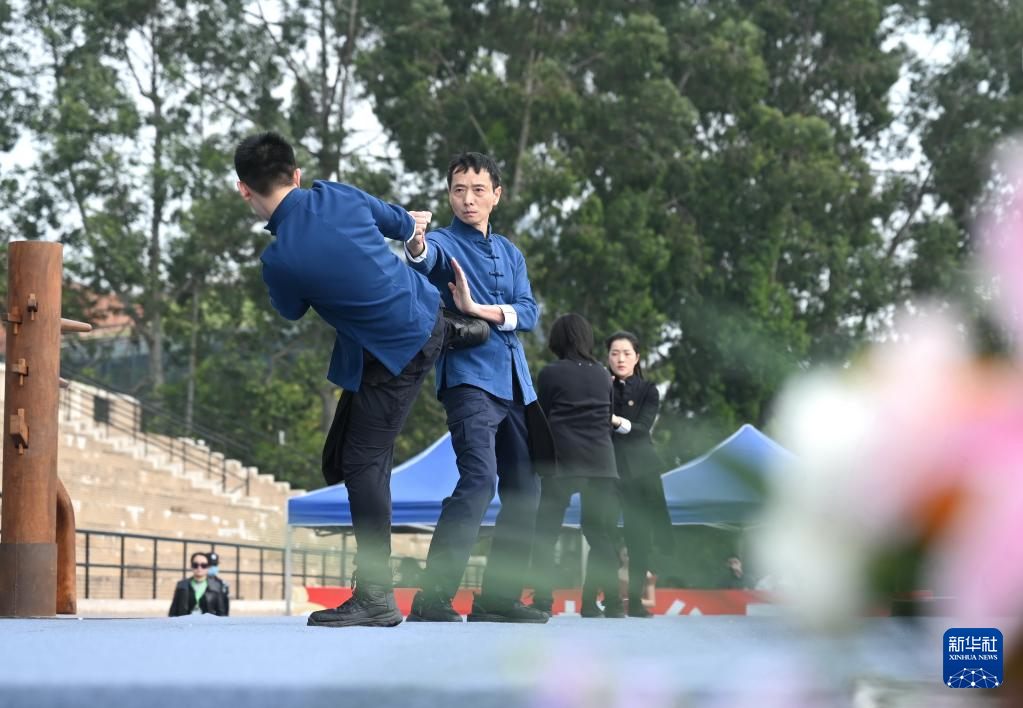 4月8日,表演者在福州大學城“優(yōu)秀傳統(tǒng)文化進校園”開幕式上演出詠春拳《龍的傳人》。