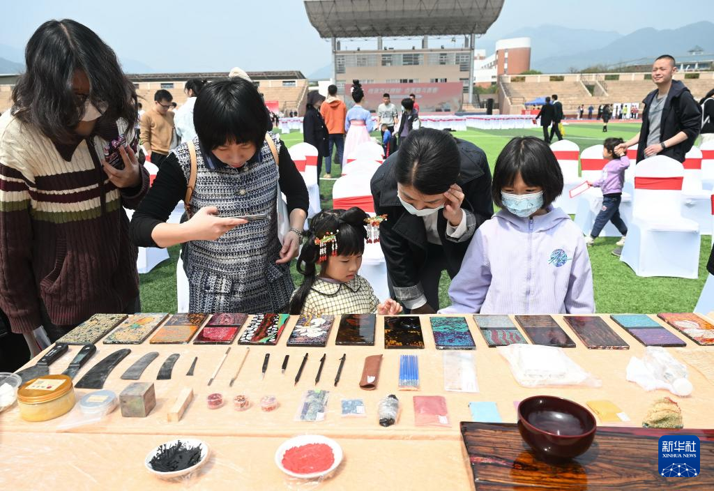 4月8日,參觀者在福州大學城“優(yōu)秀傳統(tǒng)文化進校園”開幕式上欣賞福州漆藝制品。