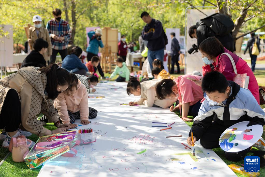 4月8日,孩子們在上海市寶山區(qū)顧村公園“櫻畫書藝”活動上創(chuàng)作。