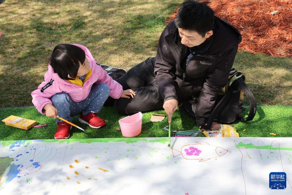 4月8日,家長和孩子在上海市寶山區(qū)顧村公園“櫻畫書藝”活動上創(chuàng)作。