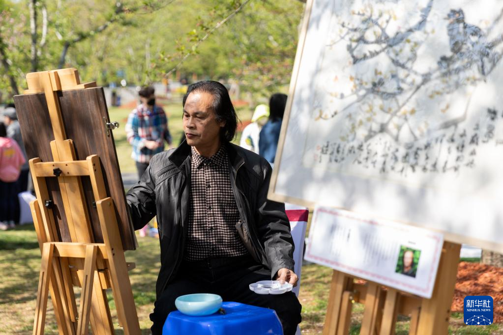 4月8日,書畫家在上海市寶山區(qū)顧村公園“櫻畫書藝”主題展覽上創(chuàng)作。