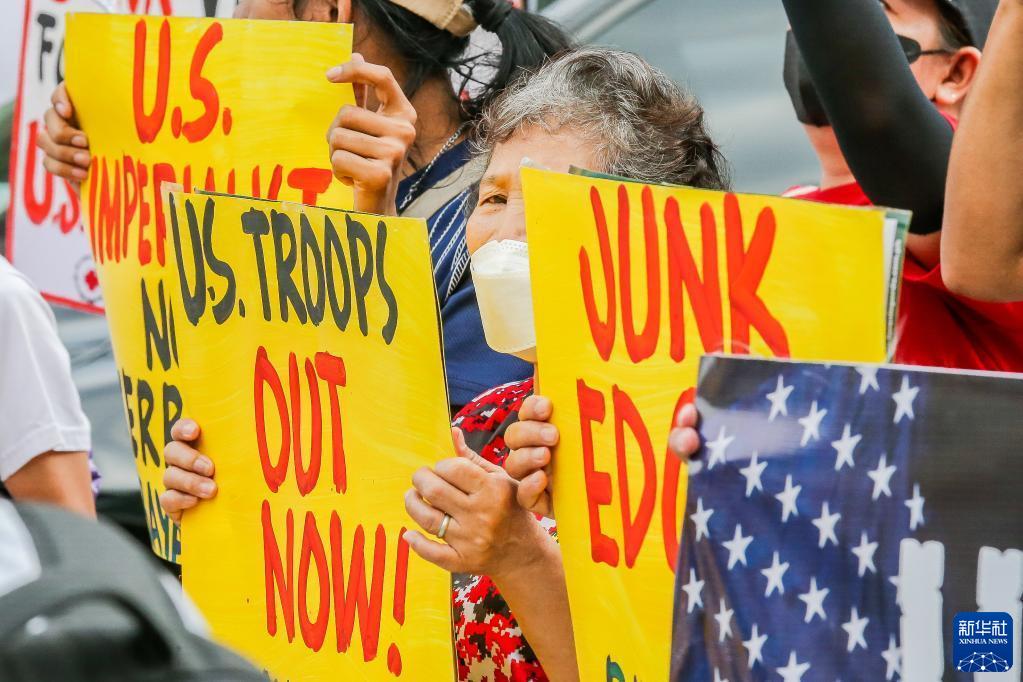 4月11日,在菲律賓首都大馬尼拉地區(qū)奎松城,民眾參加集會活動,抗議菲律賓和美國軍方舉行聯(lián)合軍事演習(xí)。