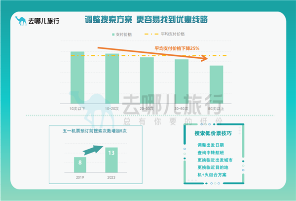去哪兒數(shù)據(jù)顯示,截至4月12日,“80后”“90后”的五一機票預訂量同比2022年增長5倍,為各年齡段增長最高。節(jié)假日前,用戶預訂前平均搜索量為13次,較2019年平均增加5次。通過調(diào)整搜索方案,更容易淘到低價票。搜索比價50次以上的用戶比搜索10次以下的用戶,淘到低價票的概率更高,平均支付價格低四分之一。