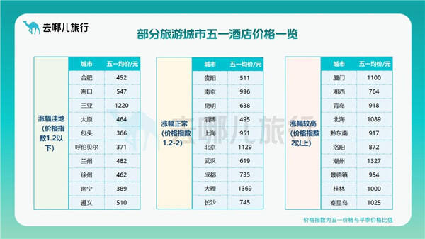 盡管五一預訂火爆,依然存在一些可撿漏的目的地。據(jù)去哪兒統(tǒng)計,廣東陽江、青海西寧、山西太原、甘肅蘭州等目的地酒店預訂尚未起量,廣東東莞、貴州遵義、江蘇徐州、廣西南寧等地酒店價格并無明顯增長。