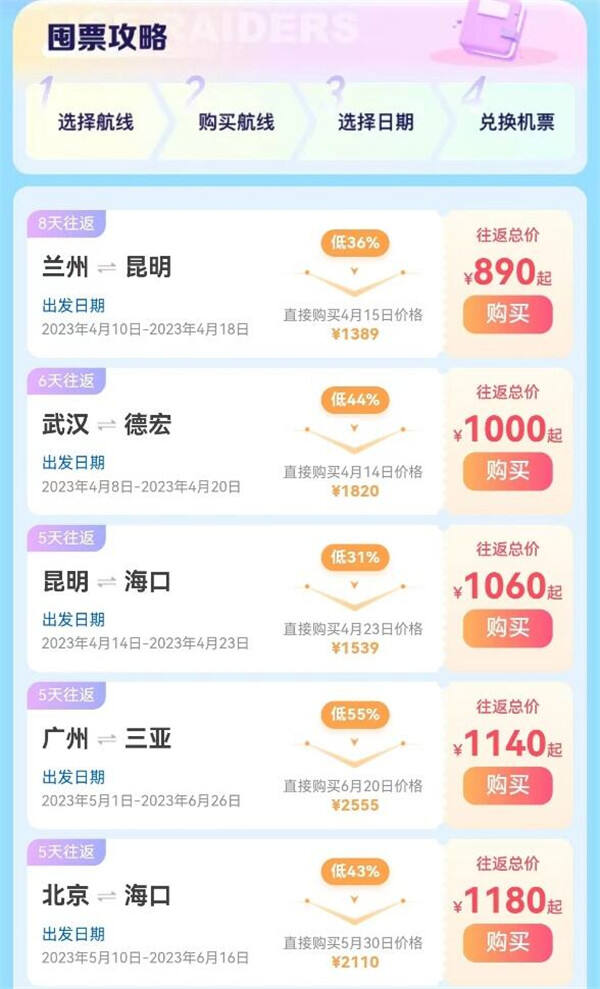 為滿足大學生低價出行的需求,去哪兒推出“校園卡”,18-26周歲學生均可免費領取,享受火車最高速購票(1年4次)、無憂退改,飛機快速安檢、延誤補償,酒店提前入住、延遲退房等權益。此外,去哪兒也上線了“機票提前囤”項目,提前購入低價預售機票,再選擇心儀時間兌換機票,未兌換或過期可退全款。