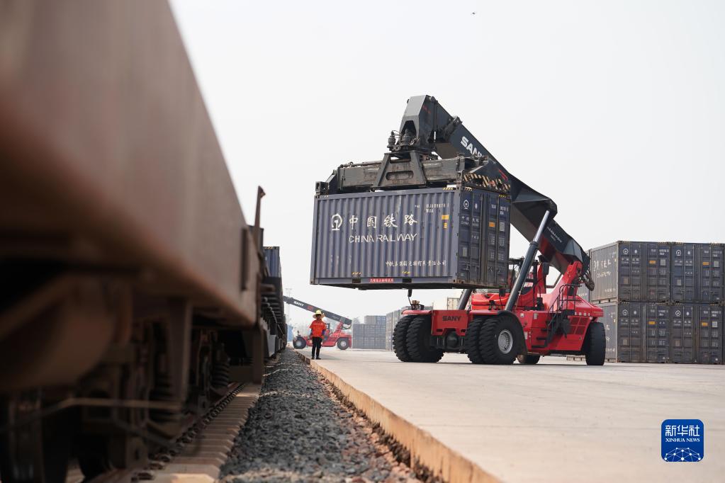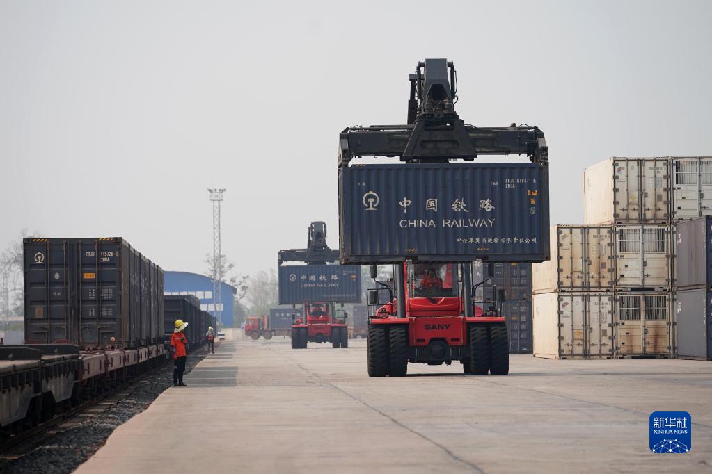 4月15日,老中鐵路公司的員工在老撾萬(wàn)象南站裝運(yùn)貨物。