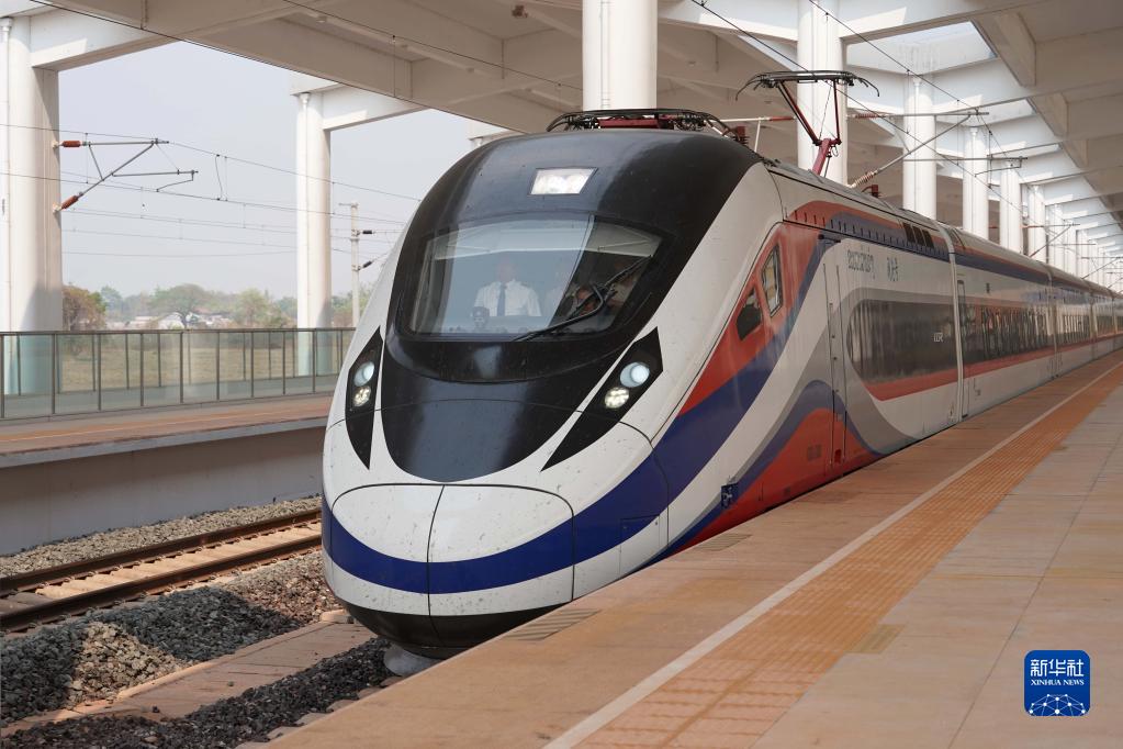 4月15日,中老鐵路列車駛出老撾萬(wàn)象站。
