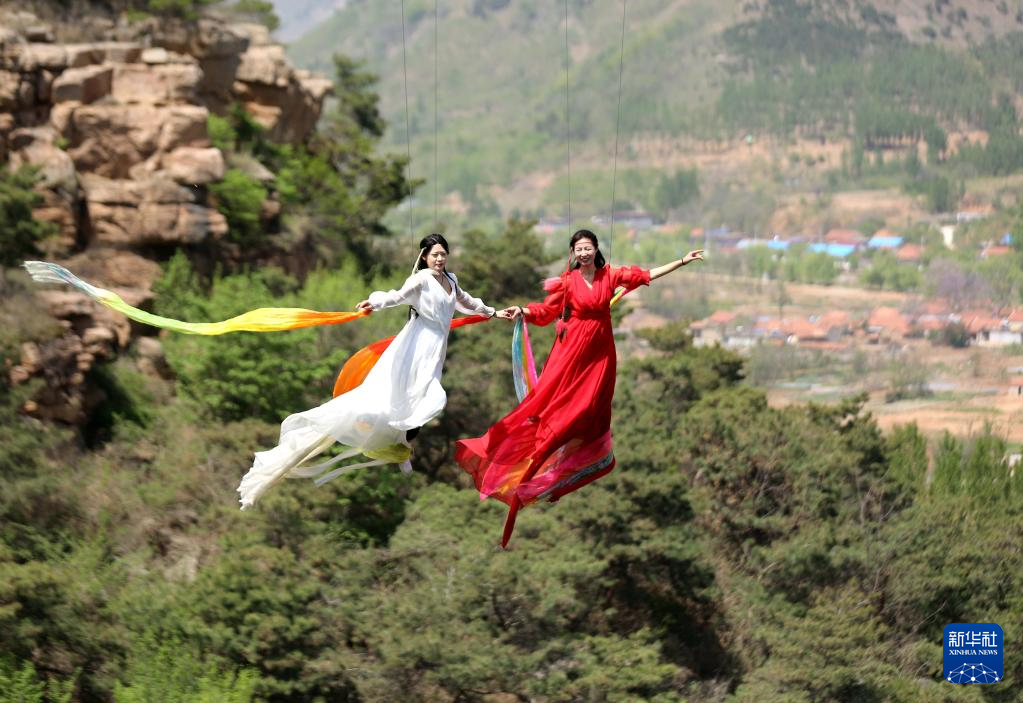 4月16日,游客在沂南縣紅石寨景區(qū)體驗高空威亞項目。新華社發(fā)(王彥冰 攝)