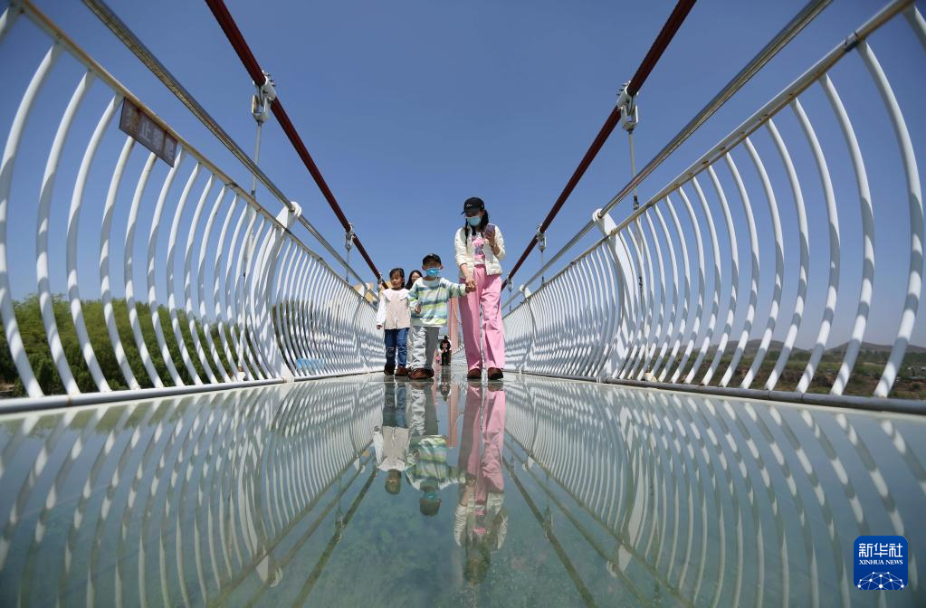 4月16日,游客在沂南縣紅石寨景區(qū)體驗高空玻璃吊橋。新華社發(fā)(王彥冰 攝)