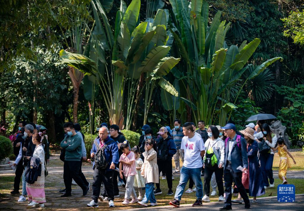 游客在位于云南省西雙版納州勐臘縣勐侖鎮(zhèn)的中國科學院西雙版納熱帶植物園內(nèi)游覽(2023年2月12日攝)。新華社記者 陳欣波 攝