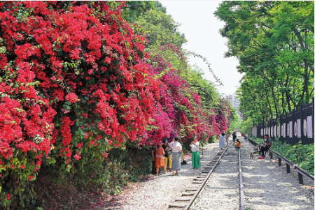 連日來,昆明地臺寺附近的米軌鐵路旁綿延數(shù)百米的三角梅陸續(xù)盛開,姹紫嫣紅的壯觀花景吸引眾多市民游客前來拍照打卡。該段鐵路是有著百年歷史的滇越米軌鐵路,目前已經停止使用。近年來,五華區(qū)蓮華街道在鐵路沿線兩側栽種三角梅300余株,讓百年米軌變身新晉“網紅”,傳承了文化,匯聚了人氣。見習記者 謝蕊燦 攝
