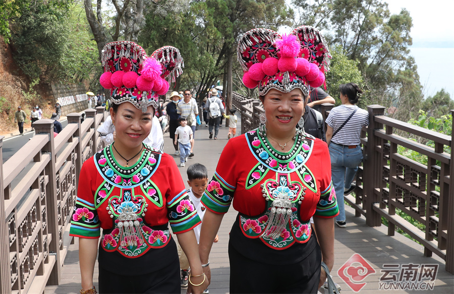 春城市民穿著艷麗的民族服裝,登山踏青。