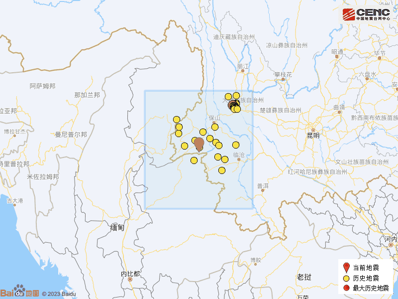 歷史地震:根據(jù)中國地震臺網(wǎng)速報目錄,震中周邊200公里內近5年來發(fā)生3級以上地震共113次,最大地震是2021年5月21日在云南大理州漾濞縣發(fā)生的6.4級地震(距離本次震中204公里),按震級大小前50次歷史地震分布如圖。