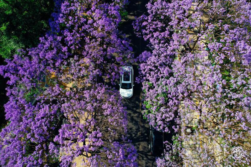 長(zhǎng)約1.4公里的藍(lán)花楹大道兩旁,551株藍(lán)花楹花事盛大,風(fēng)鈴般的花朵一簇簇地綴在枝頭,隨著暖風(fēng)溫柔地?fù)u曳。前來(lái)拍照打卡的市民游客、攝影愛(ài)好者三三兩兩地漫步在花樹(shù)底下,找尋最佳機(jī)位記錄藍(lán)花楹大道的美。路過(guò)藍(lán)花楹大道時(shí),幾乎每一輛車都會(huì)放慢車速,車上乘客搖下車窗享受著行駛于花海之間的浪漫。