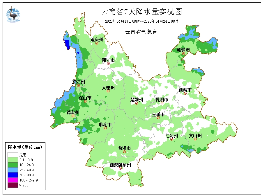 4月24日:文山南部多云間陰有中雨,昭通、曲靖、文山北部、紅河南部、普洱、西雙版納、臨滄、保山、德宏、怒江、迪慶多云有陣雨局部中雨,其它地區(qū)晴間多云。