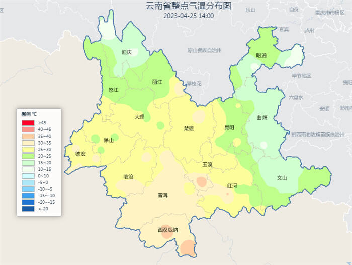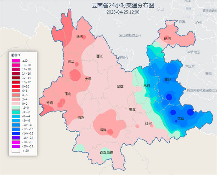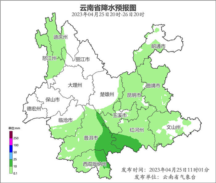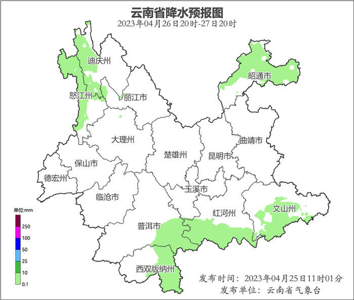 4月25日20時-26日20時:紅河南部、普洱東部、西雙版納東部多云間陰有中雨,昭通南部、曲靖、文山西部、昆明、玉溪、紅河北部、楚雄東部、普洱西部、西雙版納西部、迪慶西部、怒江多云有陣雨,其它地區(qū)多云間晴。