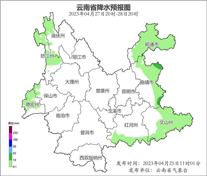 4月27日20時-28日20時:昭通、曲靖東部、文山東部和南部、紅河南部、迪慶北部、怒江北部、保山西北部、德宏北部多云有陣雨局部中雨,其它地區(qū)晴間多云。