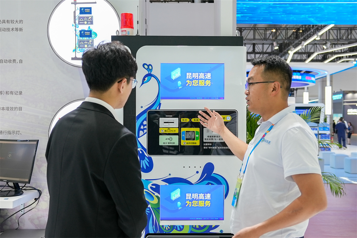 以“禮”會友。展覽會上,昆明高速公路公司“智慧路網(wǎng)平臺”“道路車載巡檢系統(tǒng)”“智慧收費站系統(tǒng)”作為云南省數(shù)字賦能的代表案例展出,吸引了眾多企業(yè)代表參觀交流。