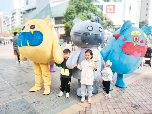 孩子們和瓦貓玩偶合影。 記者楊敏攝