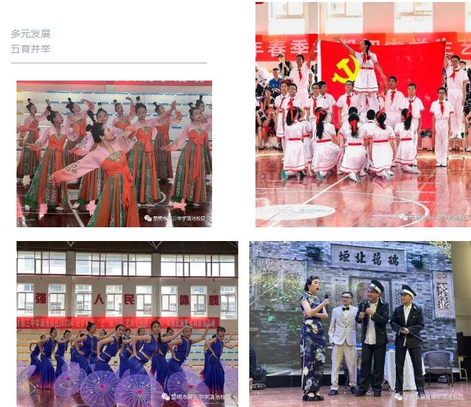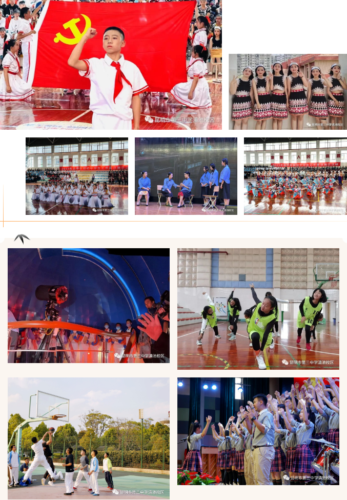昆明市第三中學(xué)滇池校區(qū)(原昆明滇池中學(xué))創(chuàng)辦于2002年9月,依托本土名校昆明三中厚重的文化和歷史沉淀,學(xué)校繼承和發(fā)揚“修己安人,琢玉成器”的校訓(xùn)精神,在昆三中教育集團陪伴式浸潤教育模式的環(huán)境下,學(xué)校管理、教育教學(xué)方法與昆明三中一脈相承。