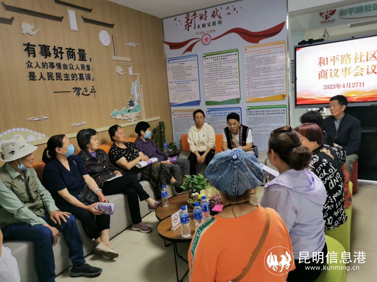 自2018年起,和平路社區(qū)作為昆明市基層協(xié)商民主試點(diǎn)社區(qū),大力實(shí)施“協(xié)商在基層”活動,推動和平路社區(qū)完成從“雞毛蒜皮”的居委會管理到“一核多維”的社區(qū)治理的轉(zhuǎn)變。社區(qū)建立協(xié)商民主“一中心四平臺”(即和平路社區(qū)協(xié)商議事中心百姓會客廳,春華天井議事會、夏荷議事亭、秋實(shí)議事閣、冬青議事園),分層級廣泛開展協(xié)商議事活動。