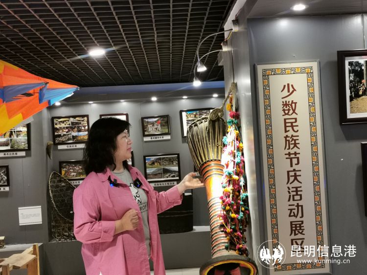 桃源社區(qū)黨委書記、居委會主任王芳介紹少數(shù)民族節(jié)慶活動展區(qū)